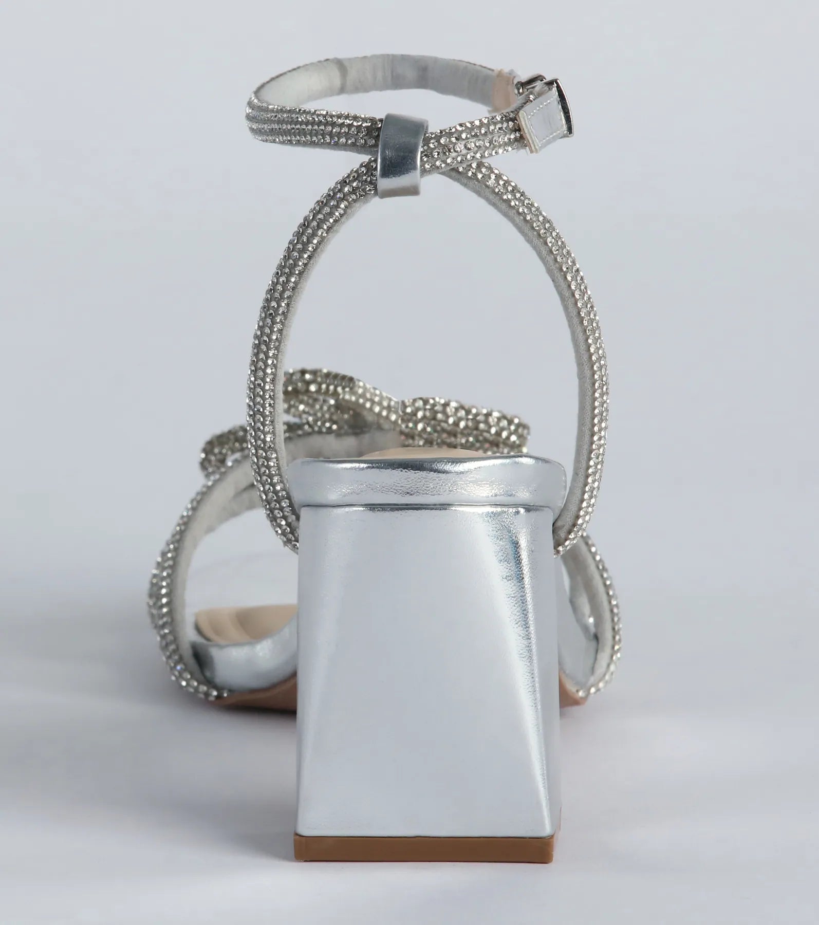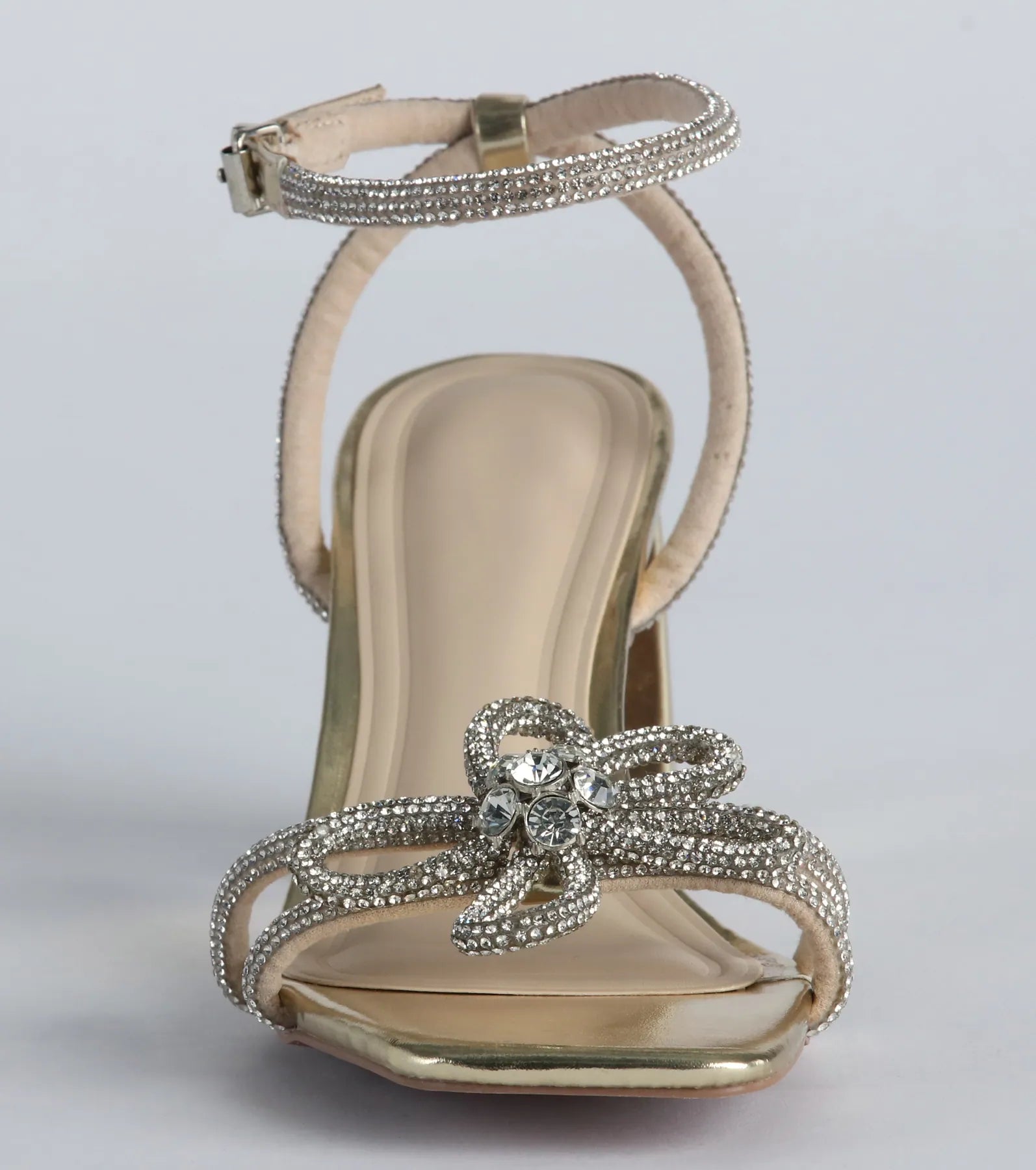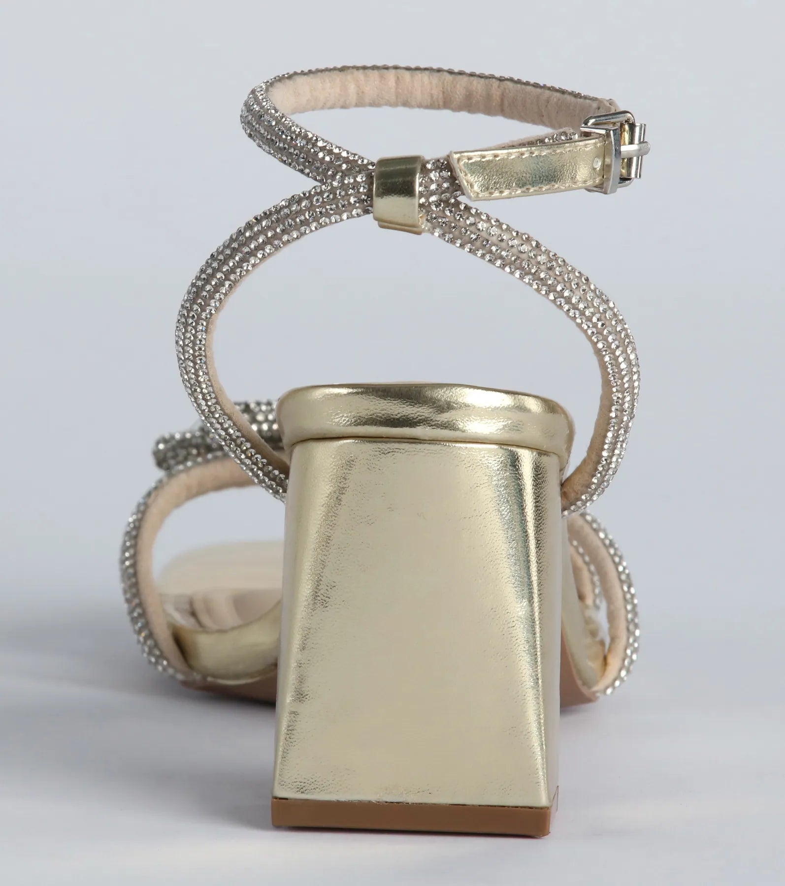 Bloom with beauty in these flower metallic block heels at special events! They feature a square toe, rhinestone-embellished toe straps with a flower decor and gemstone center, a block heel, adjustable rhinestone-embellished ankle strap with buckle closure. Complete the look with a glam and earrings!