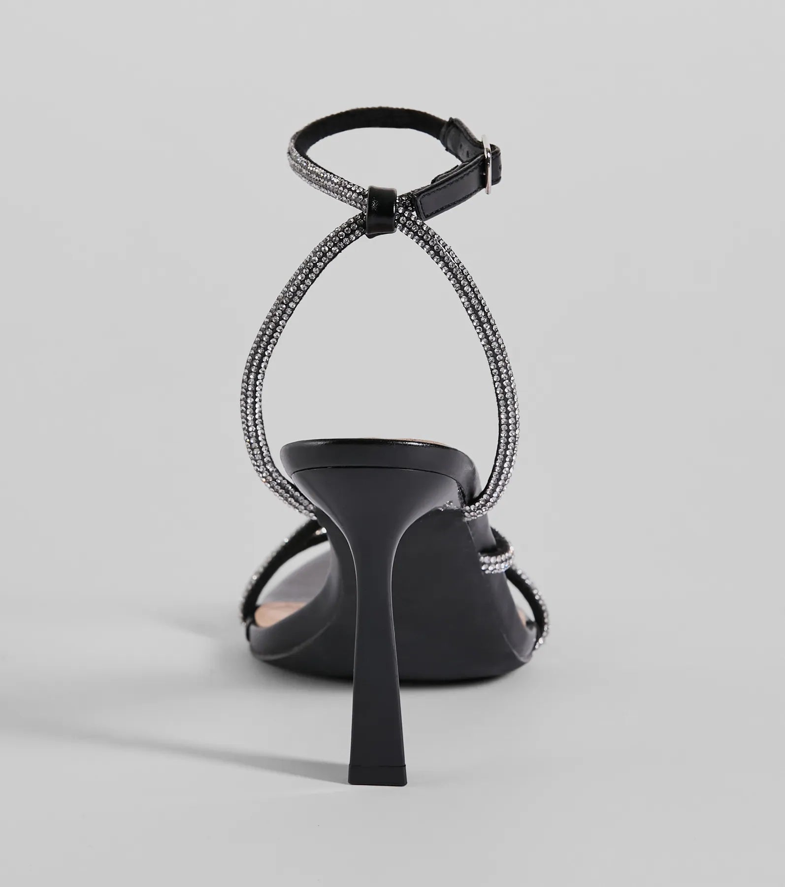 These rhinestone stiletto heels are a glam essential for any shoe lover's closet! They feature a sleek pointed toe, sparkling rhinestone embellished asymmetrical straps, an adjustable ankle strap, and buckle closure. Complete the look with a luxe .