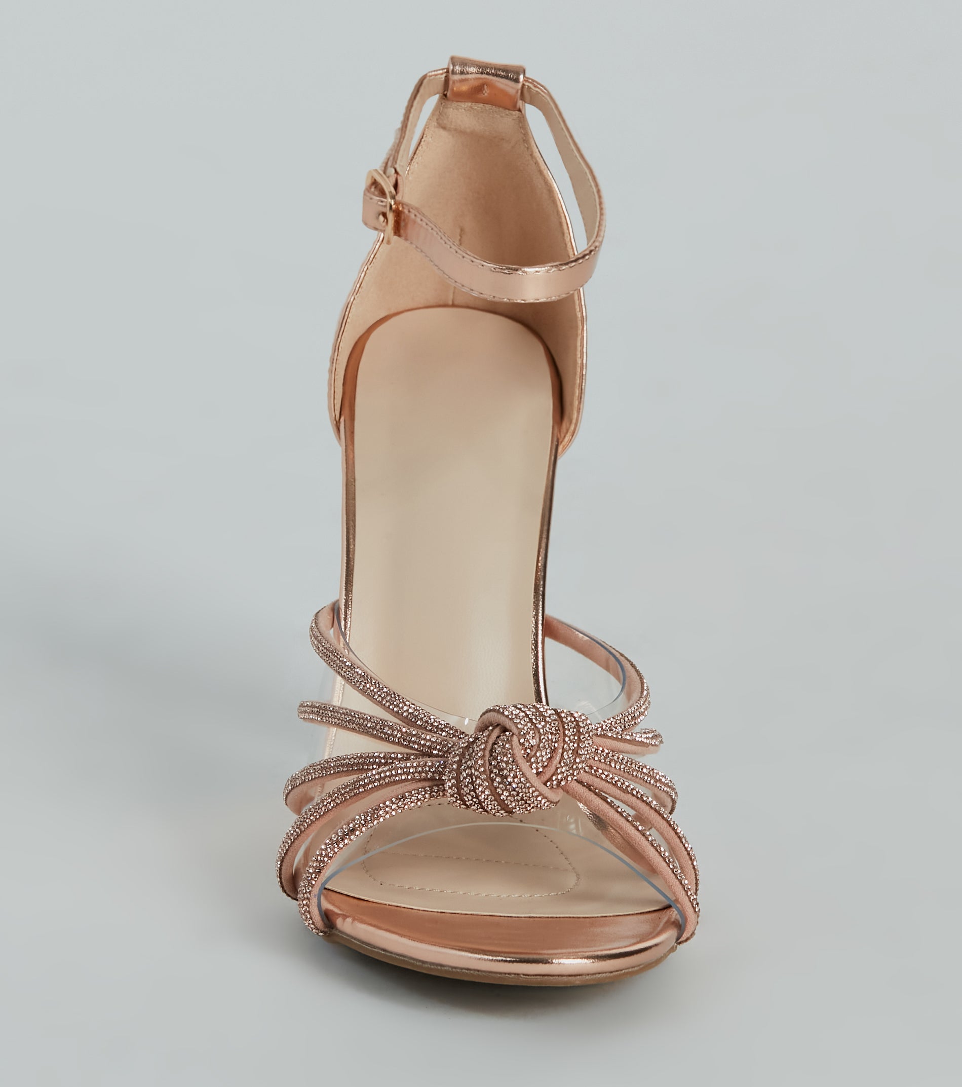 - Knotted strappy design, rhinestone embellishments, clear PVC strap