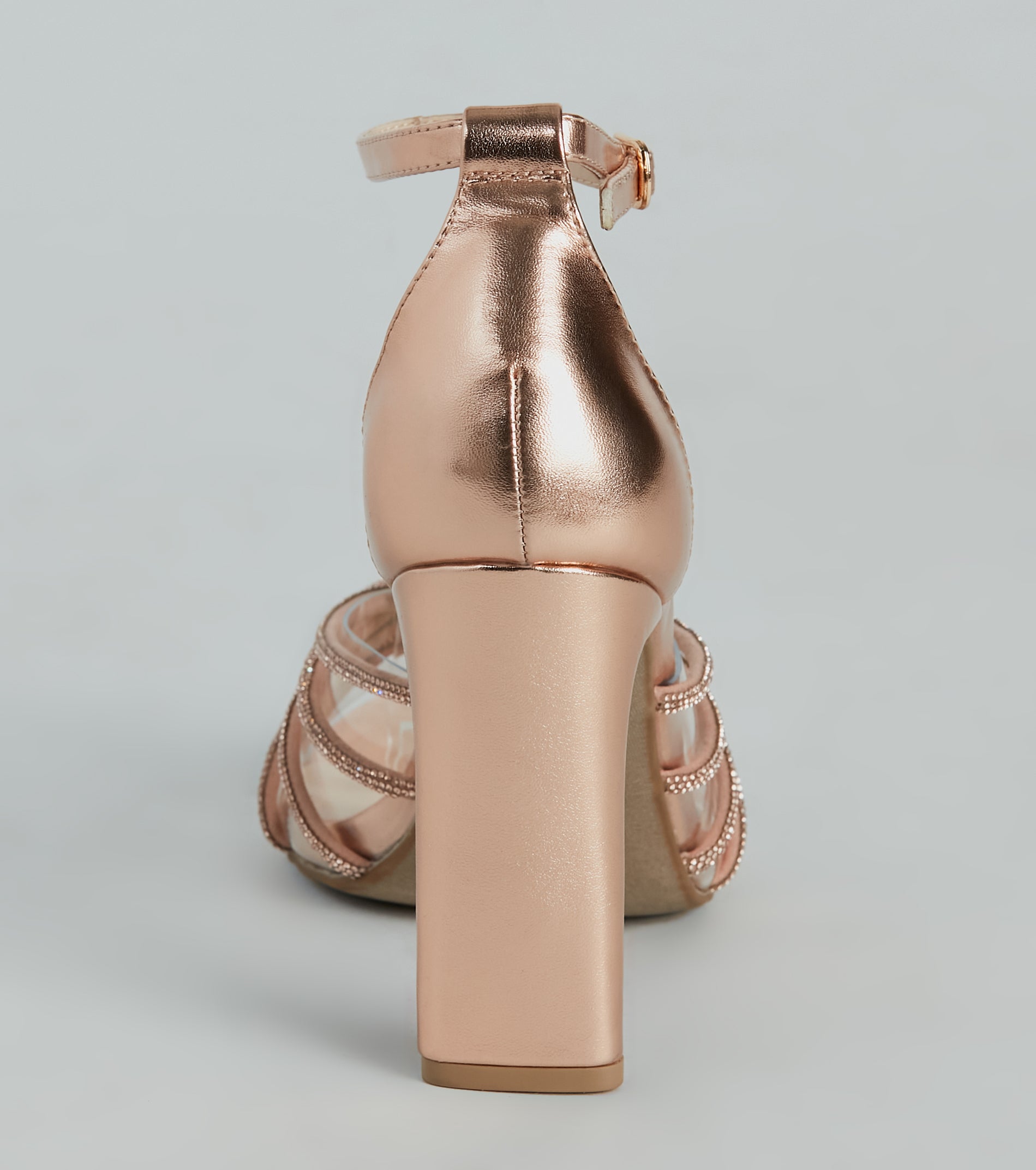 These rhinestone strappy metallic heels will put you in a glitzy mood for your dressy affair! They feature an open almond-shaped toe, a glam knotted strappy design with mini rhinestones layered over a wide clear PVC strap, a thin adjustable ankle strap, a closed back, and a sleek thin block heel. The faux leather material features a trendy chrome sheen for that extra shine. Style with !