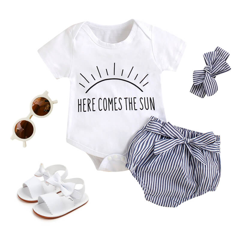 The set includes a short-sleeved white bodysuit with the lettering "Here comes the sun" and snaps on the bottom for easy changing. The bodysuit is paired with adorable striped shorts that feature a cute bow detail. The light and breathable material make this outfit perfect for warm summer days. Whether you're heading to the park or the beach, your little girl will look stylish and comfortable in this set.