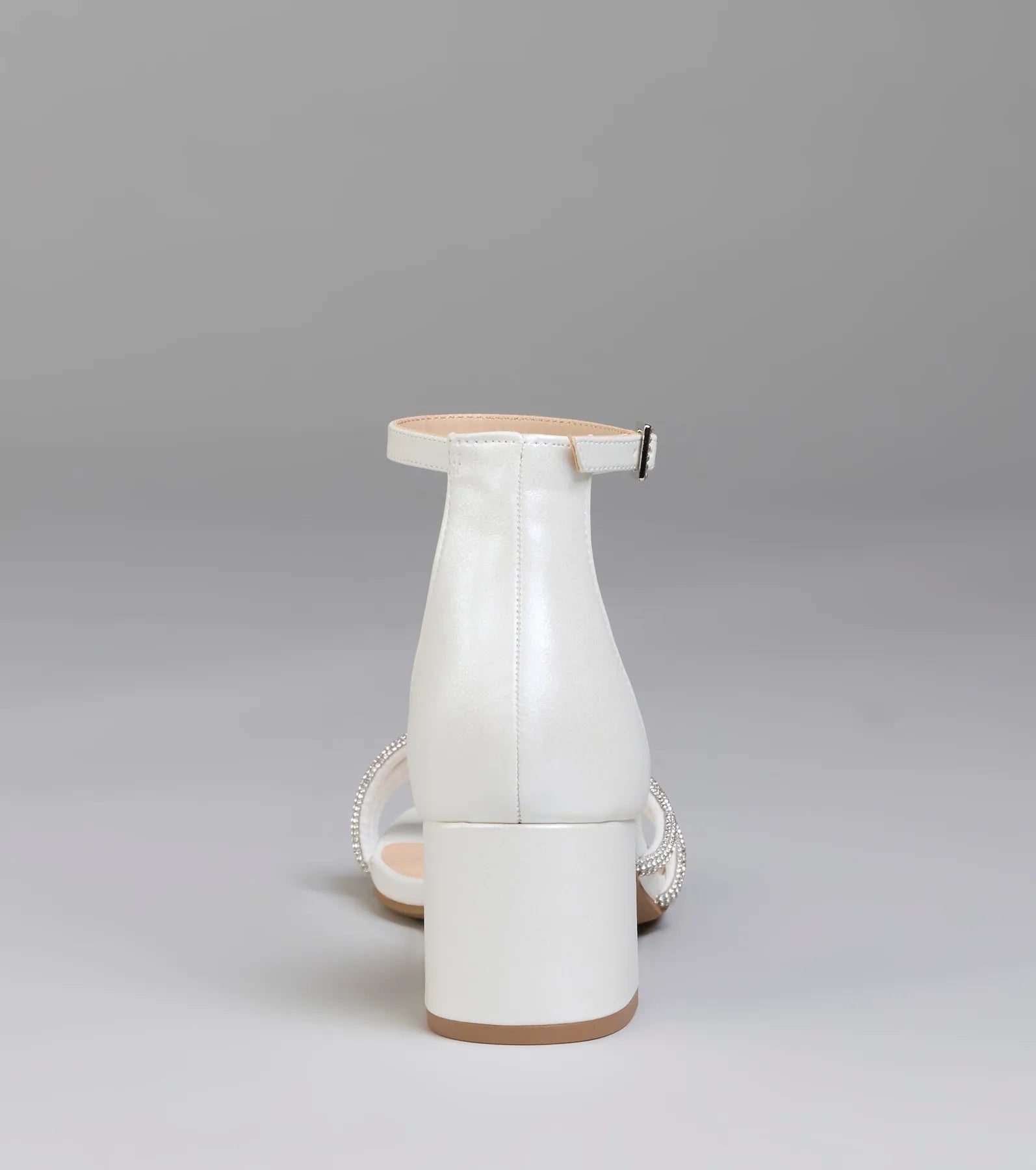 Ultra-luxe rhinestones embellish the asymmetrical toe straps on these chic short block heels perfect for brides, birthday babes, or dressy events! Pair with a clutch.